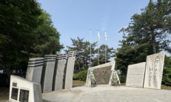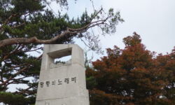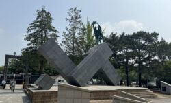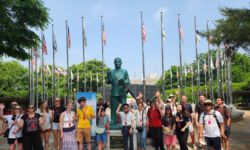 Nuri verlässt uns am Imjingak Freedom-Park, an der Demilitarisierten Zone, an dem wir zuerst anhalten. Hier gibt es einige Monumente und Erklärtafeln zum Koreakrieg, der 1950 durch eine Invasion aus Nordkorea begann. 1953 gab es ein Waffenstillstandsabkommen, wodurch die DMZ eingerichtet wurde, die über mehr als 250 Kilometer Länge und 4 Kilometer Breite die Koreanische Halbinsel in einen kommunistischen Norden und einem demokratischen Süden teilt. üIch folge zusammen mit der Gruppe unserem Guide SP. Auf dem Gelände des Parks gibt es einige Monumente und Erklärtafeln zum Koreakrieg und SP erzählt uns weitere Details.