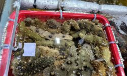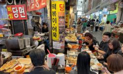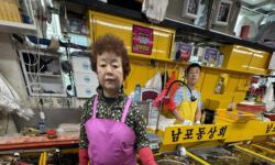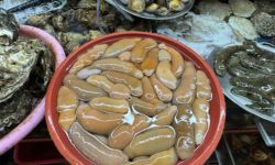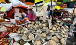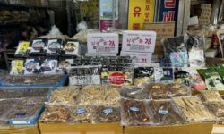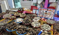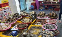 Ich hätte Lust mal einen dieser Seewürmer zu essen, die wie kleine Pimmel aussehen, aber die Verkäuferin möchte sie nur im Zehnerset verkaufen. Ich wäre schon froh, wenn ich einen runterbekommen würde. Auch Taesubs Überredungskünste helfen nichts, sie verkauft sie einfach nicht einzeln. Daher muss ich wohl, zumindest diesmal, darauf verzichten.