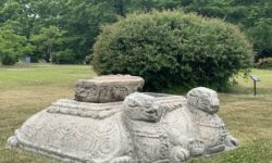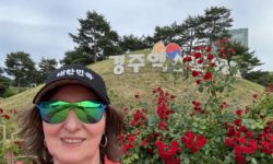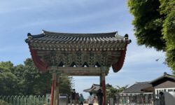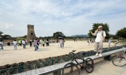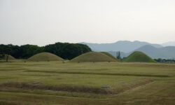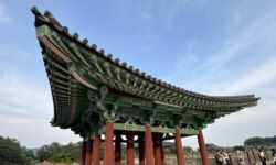 Auf dem Weg zurück nach Gyeongju, das wegen seiner Ausgrabungsstätten als das Rom Koreas bekannt geworden ist, halten wir zuerst am Gräberpark Daereungwo, in dem die ehemaligen Könige der Silla Dynastie in hohen Erdhügeln beerdigt liegen. Eins der Gräber dient als Museum und man kann innen die Struktur der Gräber ansehen. Von da aus geht es zum Nationalmuseum, einer UNESCO Welterbestätte mit tollen Ausstellungen in vier Gebäuden und einem großen Außenbereich, den man wegen seiner Weitläufigkeit am besten mit dem Fahrrad erkundet. Nicht alle aus der Gruppe können eine Strecke von fast vier Kilometern auf ebenem Gelände auf dem Fahrrad überwinden, daher werden die jüngsten unter uns mit dem Bus von Ort zu Ort transportiert. Ich schnappe mir an der Fahrradstation ein Mountainbike, das sehr klapperig ist, aber immerhin kein Körbchen hat.