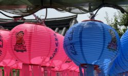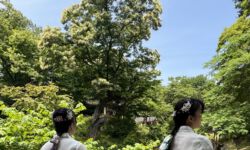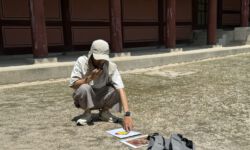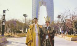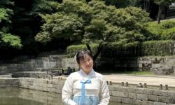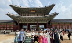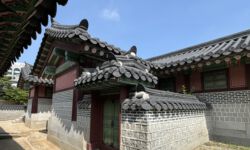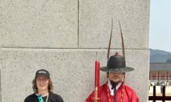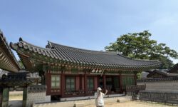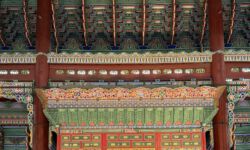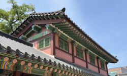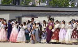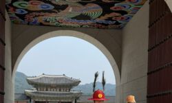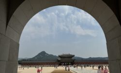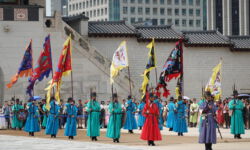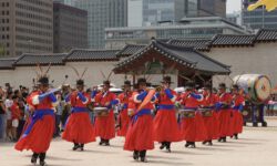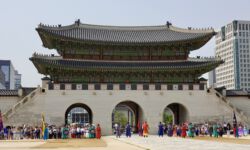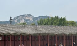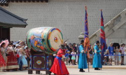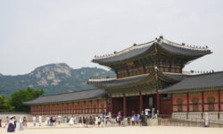 Heute geht es als erstes zum Palast Gyeongbokgung. Hier findet die Wachablösung im Stile der britischen am Buckingham Palace statt. Allerdings gibt es gar keinen König mehr zu bewachen. Es ist also nur ein Spektakel für Touristen, aber eben authentisch dargestellt. Die Kleidung der „Wachen“ war offenbar früher schon sehr bunt. Viele Zuschauer tragen einen traditionellen Hanbok, der im Hanbok-Verleih für einen Tag ausgeliehen werden kann. Ich stehe günstig für Fotos, denn die „Wachen“ gehen gerade auf mich zu. Nach zwanzig Minuten ist das Schauspiel vorbei und die Leute gehen ihrer Wege. Wir folgen Teasub, der uns mit vielen Informationen zum Palast und den einzelnen Gebäuden versorgt.