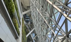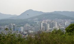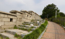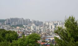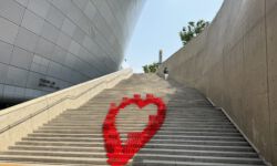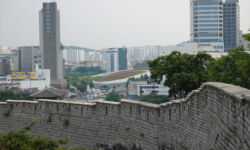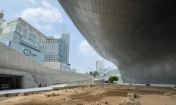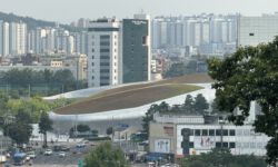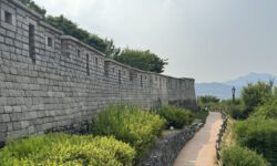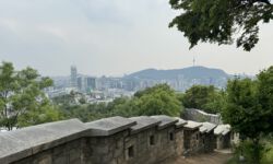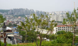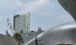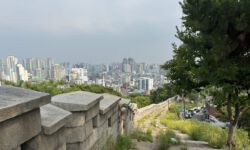 Danach wollen die anderen auf den Lotte World Sky Tower. Da ich bereits am Samstag oben war, mache ich mich alleine auf den Weg. Der Design Plaza von gestern hat es mir einfach angetan. Ich möchte noch einmal tagsüber hin und mich umsehen. Nachdem ich das Gebäude einmal umkreist habe, suche ich den Weg, der an der alten Stadtmauer hoch auf den Berg führt. Es ist ganz schön heiß heute, aber ich erklimme den Berg und habe schöne Aussichten auf die Stadt und das stylische Gebäude am Design Plaza.