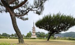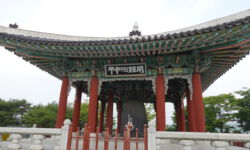Da wir aber noch bis Gyeongju weiterfahren wollen, gehe ich lieber auf Fotopirsch und verzichte aufs Essen. Es ist alles so schön bunt und quirlig hier, ich könnte mehrere Tage hier verbringen und mir das Treiben ansehen. Wir steigen zur verabredeten Zeit in den Bus und fahren weiter in Richtung Gyeongju. Unterwegs halten wir am Grab des Königs Munmu. Das ist ein Unterwassergrab des Königs, der drei Königreiche vereinigt hat und der dreißigste König von Shilla wurde. König Munmu wurde verbrannt und seine Asche wurde im Meer über den Steinen verstreut, damit sie ein Wasserdrachen wurde, der Korea beschützt.