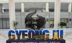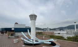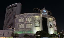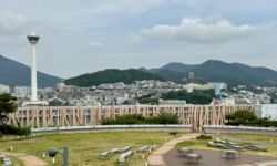 Heute müssen wir schon wieder auschecken, doch bevor wir in die näxte Stadt Gyeongju fahren, gehen wir ins Lotte-Kaufhaus. Lotte ist ein multinationaler Mischkonzern und eines der fünf größten Konglomerate Südkoreas. Sogar alle 7/11-Stores gehörern zu Lotte. Drinnen sieht es aus wie bei Karstadt oder Kaufhof. Von der Dachterrasse aus haben wir einen sehr schönen Rundumblick auf Busan.