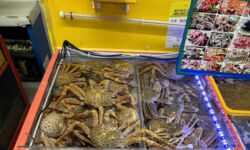Wir gehen einmal durch die ganze Fischmarkthalle und staunen. Taesub erklärt uns an einigen Becken, was das für seltsame Meeresbewohner sind. Man kann sie hier kaufen und mit nach oben in die zweite Etage nehmen. Dort werden sie dann im Restaurant zubereitet und serviert. Dabei werden viele der Meerestiere roh gegessen.