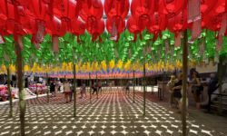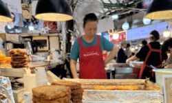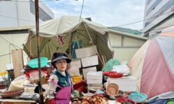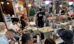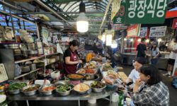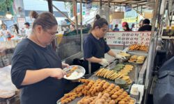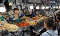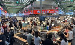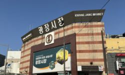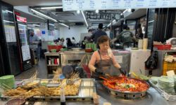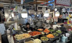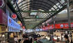 Wir gehen weiter zu den Marktständen in der Innenstadt. Hier gibt es für mich eine schöne neue Kappe auf der Korea in koreanisch geschrieben steht. Die nehme ich! Damit kann ich nun weiterreisen. Auf dem Markt gibt es neben Imbissständen auch Kleidung, Haushaltswaren und vieles mehr. Im überdachten Teil der Markthalle kann man auch auf kleinen Stühlchen sitzen und die frisch zubereiteten Leckereien verspeisen.