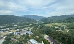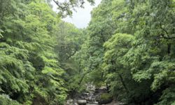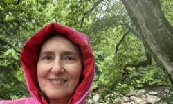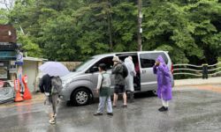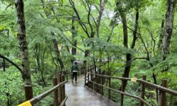 Von 14 Leuten bleiben 4 übrig, die bei diesem Wetter wandern wollen. Die anderen nehmen ein Taxi rauf zum Tempel. Der Waldweg ist sehr schön und mit der neuen, rosafarbenen und wasserdichten Regenjacke kann man prima auch durch den starken Regen gehen. Wir sehen einen Bach, Felsen und eine Wildschweinrettungsleiter. Die ist für Menschen, die sich vor angreifenden Wildschweinen im Wald retten müssen. Oben auf der Treppe gibt es einen Alarmknopf, mit dem man Hilfe rufen kann. Bei dem Regen ist hier aber kein Schwein, daher laufen wir weiter zu den Taxifreunden.