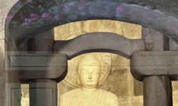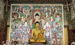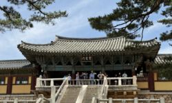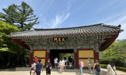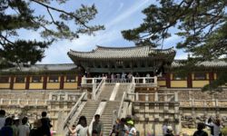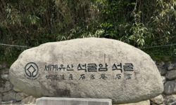Wir fahren mit unserem Bus zum Tohamsan District südöstlich von Gyeongju. Dort befindet sich die Seokguram Grotte mit einem großen steinernen Buddha. Zuvor erzählt uns Taesub etwas über den Buddhismus und die verschiedenen Buddhismusrichtungen auf einer kleinen Tafel, die er mitgebracht hat. Um zur Erleuchtung zu gelangen muss man ziemlich vielen Regeln folgen. Ich fühle mich sowieso schon erleuchtet, denn die Sonne meint es auch heute wieder gut mit uns.