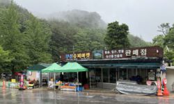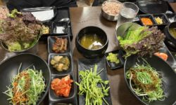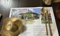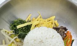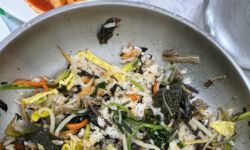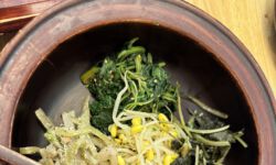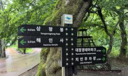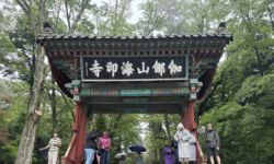 Heute fahren wir zum buddhistischen Tempel Haeinsa bevor es weitergeht nach Seoul. Taesub erklärt uns anhand seiner im Bus aufgehängten Koreakarte die Wegstrecke und die Dauer der Fahrt. Nach 2 Stunden erreichen wir die Tempelanlage Haeinsa. Bevor wir uns die Tempel ansehen, bekommen wir ein Mittagessen in einem kleinen Restaurant. Es gibt Bibimbap, eine koreanische Spezialität mit Reis und Gemüse. Je nach Region wird es unterschiedlich zubereitet. Das Hauptgemüse liegt in einer großen Schüssel und der gekochte Reis wird auf das Gemüse gelegt. Dann wird alles umgerührt und man kann noch weiteres Gemüse und eine Soße unterrühren. Dazu gibt es noch eine Suppe. Es sieht nicht nur lecker aus, es schmeckt auch richtig gut.