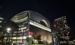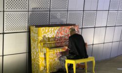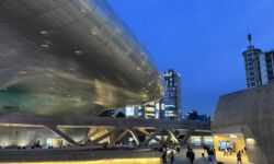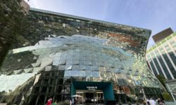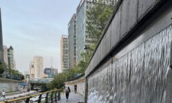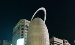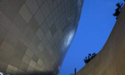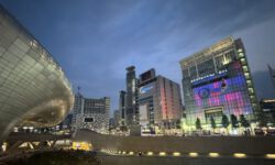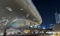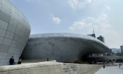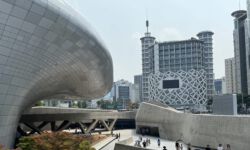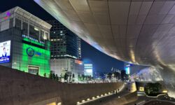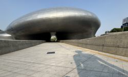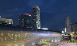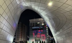 Ich fahre mit der U-Bahn zurück und halte an der Station Dingdaemun Design Plaza. Dieser Platz befindet sich im Dongdaemun History & Culture Park, der einen Teil der ältesten erhaltenen Festungsmauer Seouls aus der Joseon-Dynastie enthält. Nach Abschluss der Ausgrabungen begann die Konstruktion des von Zaha Hadid und Samoo Architects & Engineers entworfenen Dongdaemu Design Plaza, der 2014 eingeweiht wurde. Nach dem Aussteigen aus der U-Bahn staune ich nicht schlecht. Ich bin mitten im Designzentrum gelandet. Unter einer silbernen „Untertasse“ steige ich nach oben und gehe außen herum. Das ist mal ein scharfes Design, das mir extrem gut gefällt. Noch dazu sieht es jetzt im Dunklen mit dem Licht besonders gut aus. Ein Klavierspieler erfreut die Vorbeilaufenden mit klassischer Musik. Hier trifft sich Historisches mit coolem neuen Design wie es besser nicht sein könnte. Wow!