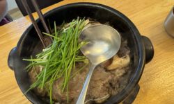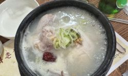 Teasub geht mit uns anschlieẞend zu einem kleinen koreanischen Restaurant. Heute probieren wir Tam Ke Tang, das ist ein ganzes Hühnchen gekocht in einer Suppe. Jeder bekommt seine eigene Schüssel mit einem eigenen Hühnchen. Dazu gibt es Kimchi, das sind gewürzte Kohlblätter, die es zu fast jedem Essen gibt. Die Vegetarier essen wieder Bibimbap. Ich finde das Hühnchen klasse und dieser Kimchi ist besser als sonst, denn er ist nicht zu scharf.