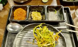 Dann verlassen wir den Palast wieder und gehen zum Mittagessen. Teasub hat wieder ein hervorragendes kleines Restaurant für uns ausgesucht, in dem wir koreanische Spezialitäten bekommen. Heute ist es Han-jung-sik, das in vielen kleinen Schälchen serviert wird. Es gibt Fisch, vielen Gemüsesorten, Fleisch und natürlich Reis und Suppe. Wie immer ist es für uns außergewöhnlich und sehr lecker.