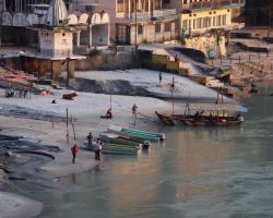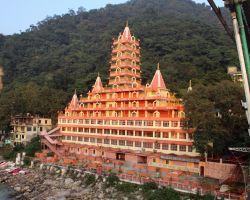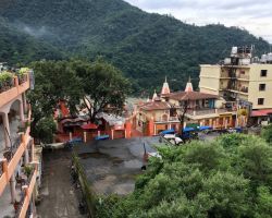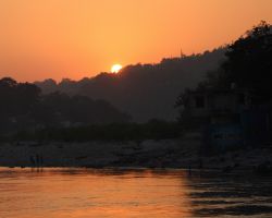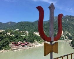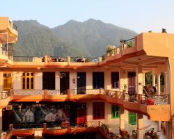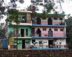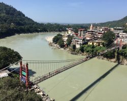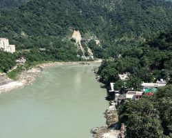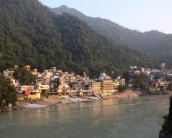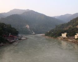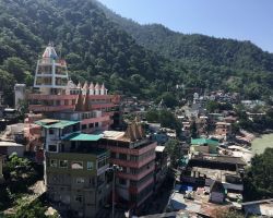 Rishikesh, the holy city! Hier gibt’s statt Bier und Fleisch Yoga und Meditation. Der breite Ganges ist hier noch relativ sauber, jedenfalls im Vergleich zu den tiefer liegenden Abschnitten. Das ist aber eigentlich auch egal, denn der ganze Fluss ist ja heilig. So kommen viele Pilger täglich zum Beten und schwimmen im Fluss oder segnen sich mit dem Gangeswasser. Wir verzichten auf die heilige Reinigung und freuen uns, dass unser Hotel ein recht gut funktionierendes Bad besitzt. Außerdem ist die Aussicht nicht so schlecht, wir haben einen kleinen Balkon und können von da aus ein Stückchen vom Ganges und ein ziemlich buntes Hotel sehen.