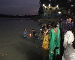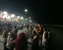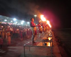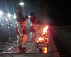 Abends sehen wir uns am Triveni Ghat, an dem die drei heiligen Flüssen – Ganga, Yamuna und Saraswati – zusammenkommen die Feuerzeremonie an. Der Triveni Ghat ist mit Gläubigen überfüllt, die rituelle Bäder nehmen, um sich von ihren Sünden zu reinigen. Die Gläubigen beten und singen jeden Abend zusammen und lassen Blumen und Feuerschalen den Ganges entlangfließen bevor sie selbst ein Bad nehmen oder sich mit dem heiligen Wasser segnen. Für uns wäre ein kaltes Bier ein Segen, aber das gibt es im heiligen Rishikesh nicht. Noch nicht mal ein warmes. 🙁