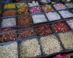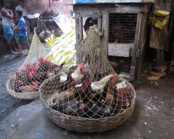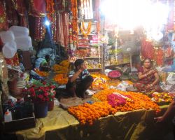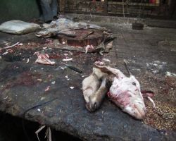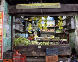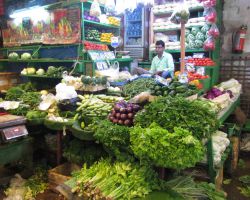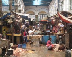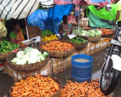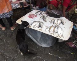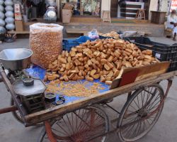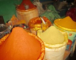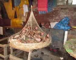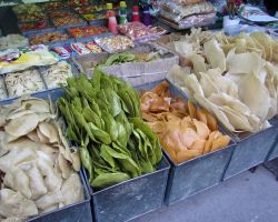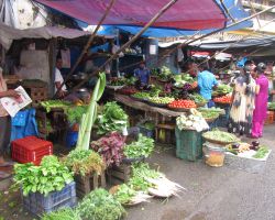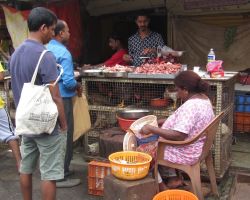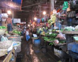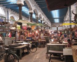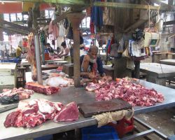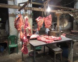 Am nächsten Morgen gehen wir auf den Markt. Der Fleischmarkt ist martialisch. Hier arbeiten Menschen im Alter von acht bis achtzig, morgens werden die Tiere vor Ort geschlachtet und dann direkt zerteilt. Frischer geht‘s nicht. Kinder sitzen auf dem Boden im Blut und reißen Hühnern die Federn aus, Greise sitzen im Schneidersitz auf Tischen und zerschneiden das Schlachtvieh, andere liegen herum und schlafen. Eine Nasenklammer wäre nicht schlecht. Weiter geht‘s zum Gemüse und Obst, das schön drapiert in Körben, auf Tellern oder einfach auf der Straße liegt.