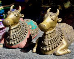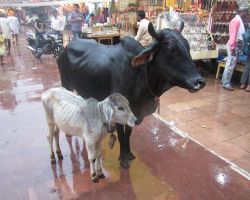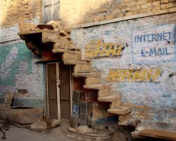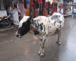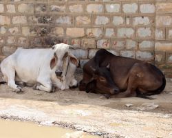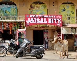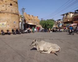 In Jaisalmer ist es ordentlich warm und nicht schwül, daher schimmeln die Häuser auch nicht. Außerdem liegt nicht so viel Müll auf den Straßen, dafür jede Menge Kühe und Straßenhunde. Die Kühe sortieren und fressen den Müll. Einige sehen so aus, als bekämen sie noch nicht einmal etwas vom Müll ab.