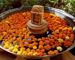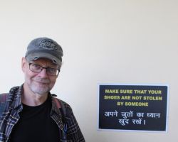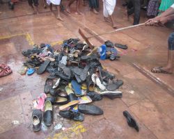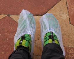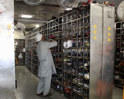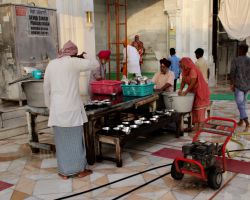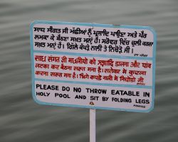Zusätzlich muss man vor dem Betreten des Tempelbereiches wie alle tausende anderen Pilger noch durch ein Wasserbecken waten, um die Füße zu „reinigen“. Im Tempelbereich rund um das Wasserbecken herum, küssen die Pilger den Boden (ja, den, auf dem alle herumlaufen), beten oder gehen in das heilige Wasser. Nach dem Beten gibt es für alle kostenlos Tee, Zwieback und kleine Süßspeisen. Dazu muss man sich im Schneidersitz auf den Boden setzen und es wird da herumgereicht. Die tausenden von Blechschälchen für den Tee werden von fleißigen Gläubigen den ganzen Tag in einer Wanne gespült. An der Schuhabgabestelle werden die Schuhe in vielen nummerierten Fächern verwahrt und gegen eine Blechmarke bekommt man sie ruxzuck wieder zurück.