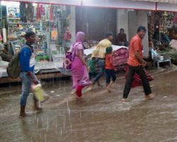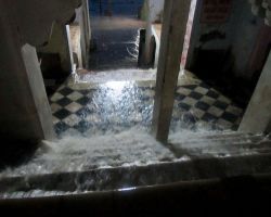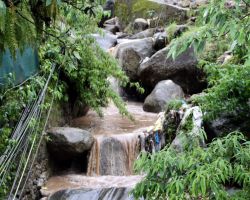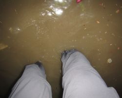 Es regnet die ganze Zeit und wir werden ordentlich nass bis es plötzlich wie aus Eimern schüttet. Wir stellen uns in einem Hauseingang unter und verharren da über eine Stunde. In dieser Zeit fließen Wassermassen an uns vorbei, die den Berg herunterstürzen. Als es fast dunkel ist, beschließen wir nach Hause zu gehen, ein Weg von ca. 1,5 km sollte ja schnell machbar sein. wenn da nur nicht diese braune Brühe wäre. Die braunen Pfützen sind kleine Teiche geworden und uns ist schnell klar, dass die Füße selbst mit wasserdichten Schuhen nicht trocken oder gar sauber bleiben können. Na gut, da kann man nichts machen, also Augen auf und durch.