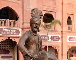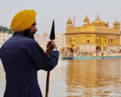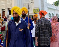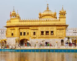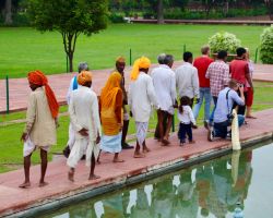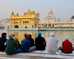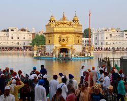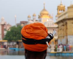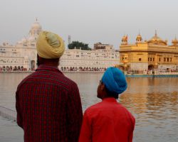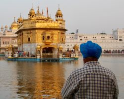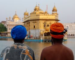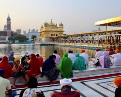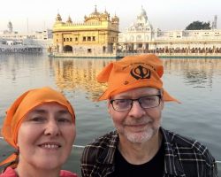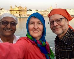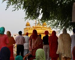 Wir verlassen Rajasthan, um noch einige Orte im Norden anzusehen. In Amritsar, im Bundesstaat Punjab, sind wir um sechs Uhr morgens losgefahren, um den schon jetzt völlig überfüllten Shikstempel, den sogenannten goldenen Tempel anzusehen. Dieser steht auf einer kleinen Insel inmitten eines Wasserbeckens. Natürlich müssen wir wieder die Schuhe ausziehen und zusätzlich muss man eine Kopfbedeckung tragen. Leider zählt eine graue Mossy Oak-Kappe nicht zu den erlaubten Kopfbedeckungen, also kriegt der Ingenieur ein orangenes Leihtuch aus einer Krabbelkiste.