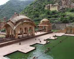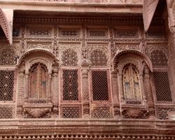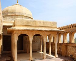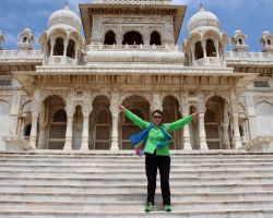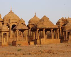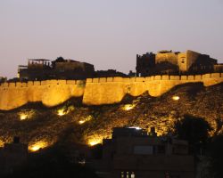 Rakesh fährt mit uns zu den Bada Bagh Cenotaphs, einer Gedenkstätte für verstorbene Könige und Königinnen und zu einem Jain-Tempel bevor wir auf der Dachterasse unseres Hotels den Blick auf das abends angestrahlte Fort und die Stadt genießen.