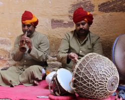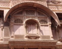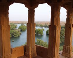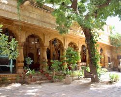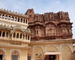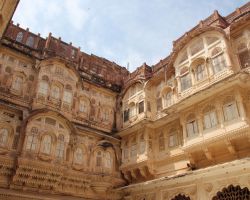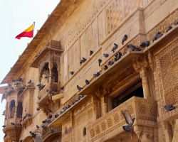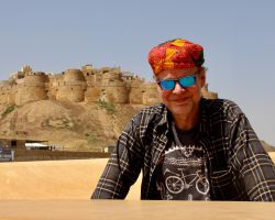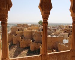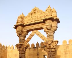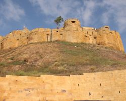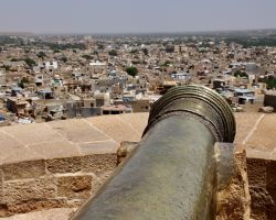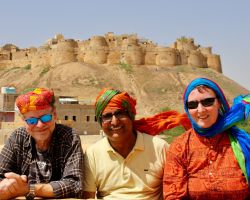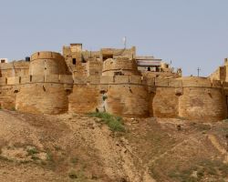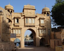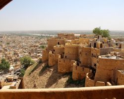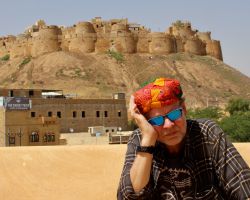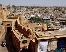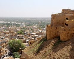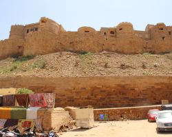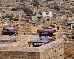 Jaisalmer hat mitten in der Stadt eine riesige Wüstenzitadelle aus gelbem Sandstein, die von weitem wie eine Fata Morgana aussieht. Je näher man kommt desto imposanter erscheint das Bauwerk. Unser Hotel liegt direkt unterhalb des Forts mit einer schönen Dachterasse, von der aus man die schöne Aussicht genießen kann. In den Mauern befinden sich mittlerweile Hotels, Restaurants, kleine Läden und früher von den reichen Kaufsmannsleuten gebaute Havelis, die zu schönen Restaurants umfunktioniert wurden. Das Innere des Forts bildet der ehemalige Königspalast. Von da oben hat man einen tollen Blick auf Jaisalmer und die Wüste drumherum.