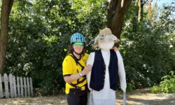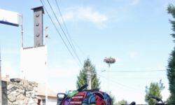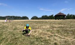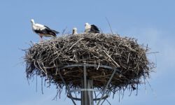 Kurze Zeit später finden wir einen Pub. Da können wir die Räder sogar unter dem Dach auf der Außenterrasse parken. Wunderbar. Wir nehmen uns sogar noch zwei eiskalte Dosen Radler 0,00 % für unterwegs mit. Von hier aus geht es weiter zur Trasse und für die näxte Pause fahren wir auch in den Ort am Wegesrand. Am Gemeindehaus finden wir einen kleinen Streifen, der nicht komplett in der Sonne liegt. Hier können wir die immer noch kalte Dose genießen. Ein Storchenfamilie sitzt in ihrem Nest, die können wir dabei beobachten.