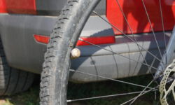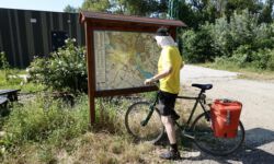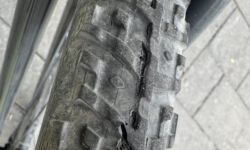 Die heutige Etappe ist wieder etwas länger, daher wollen wir früh aufbrechen. Allerdings muss erst noch der Hinterreifen meines Fahrrades inspiziert werden. Er hat wieder ziemlich viel Luft gelassen und so ganz vertrauenserweckend ist das ja nicht, auch wenn gestern alles gut gegangen ist. Dann sehe ich etwas viel Schlimmeres am Vorderrad. Da ist ein Loch im Mantel! Mit etwas Mühe kann man den Schlauch durch das Loch erkennen, denn das Gewebe im Mantel ist an der Stelle gerissen. So sollte ich sicher nicht weiterfahren. Der Schlauch kann dann auch mal schnell platzen. Das möchte ich nicht erleben, schon gar nicht mit dem Gepäck oder auf einer Landstraße, auf der die Autos an mir vorbeirasen.
