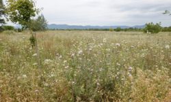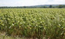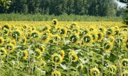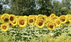 Ich suche mit dem Navi nach einem alternativen Weg, der uns nicht allzu viele Zusatzkilometer beschert. Ich finde eine Strecke, die allerdings eine Zeit lang über eine Landstraße führt. Na gut, das hatten wir ja schon mal und da hier nicht allzu viel Verkehr ist, klappt das ganz gut. Hier gibt es ein Sonnenblumenfeld, bei dem alle Köpfe auf den Boden zeigen und die Blüten gar nicht zu sehen sind. Verrückt.