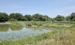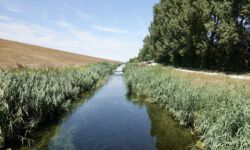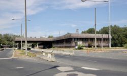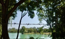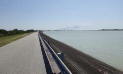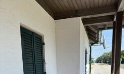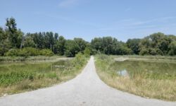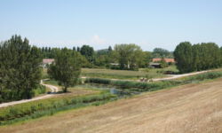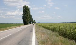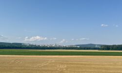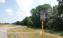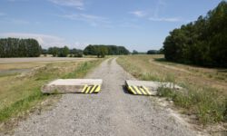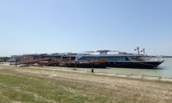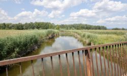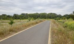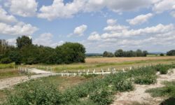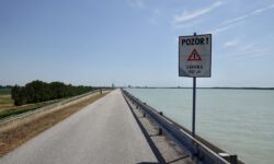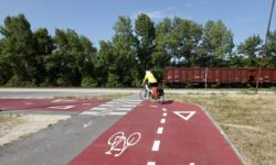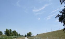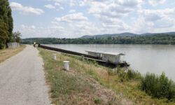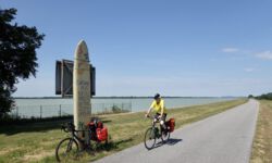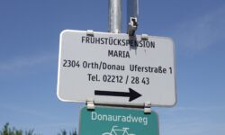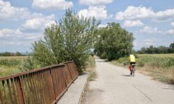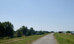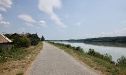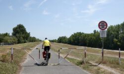 Oben befindet sich ein Biergarten, der schon auf uns wartet. Wir trinken erst einmal eine eiskalte Cola. Da es nirgendwo Schattenplätze gibt, setzen wir uns auf Steine am Wegesrand, die ein wenig im Schatten liegen. Es ist ungefähr 12 Uhr und jetzt schon ziemlich heiß. Dann fahren wir weiter, wir haben ja noch ein paar Kilometer vor uns. Nun geht es auf den Eurovelo 6, der in 4450 Kilometern vom Atlantik bis ans Schwarze Meer führt und eine Traumreise für alle Radfahrenden sein soll. Wir sind gespannt. Leider führt uns der Weg schnell weg von der Donau, so dass sie gar nicht mehr zu sehen ist. Stattdessen fahren wir ungefähr 25 Kilometer auf einer schnurgeraden Hochtrasse, die als Hochwasserschutzgebiet ausgewiesen ist. Mittlerweile ist es brülleheiß. Hier gibt es keinerlei Schatten und unser Wasser kocht gleich in den Flaschen. Naja, nicht ganz, aber es ist richtig warm und überhaupt nicht erfrischend. An einem kleinen Bahnübergang halten wir an und quetschen uns ans Haus, um von der kleinen Überdachung zumindest etwas Schatten zu erhalten. Hier sieht es ein bisschen wie im Film „Spiel mir das Lied vom Tod“ aus. Außer uns ist hier niemand.