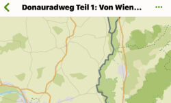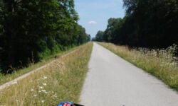 Nach einer ausgedehnten Pause machen wir uns wieder auf den Weg. Nach einem Kilometer fahren wir wieder auf die Trasse und die führt hier endlich mal wieder direkt an der Donau entlang mit Blick aufs Wasser. Schon bald ist die Donau nicht mehr zu sehen, weil nun wieder Bäume die Sicht versperren. Der Durst kommt zurück und nun finden wir sogar ein kleines Schattendach auf der Trasse. So richtig schattig ist es da auch nicht, aber immerhin können wir hier ein paar Minuten auf einer Bank ausruhen.
