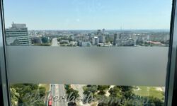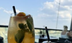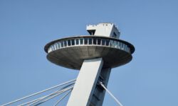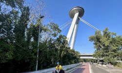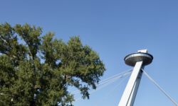 Dann gehen wir zum UFO, das wir gestern schon von weitem aus dem Fahrradsattel gesehen haben. Ein Fahrstuhl fährt uns zuerst auf eine kleine Dachterrasse, von der wir wieder Bratislava und die Donau sehen können und nun auch die Burg, die wir eben noch besucht haben. Im UFO gibt es ein nobles Restaurant und einen Barbereich. Ein schönes Getränk mit Aussicht hatten wir doch lange nicht mehr, also erst einmal rein in die Bar. Das UFO wackelt die ganze Zeit merklich im Wind. Ich hoffe, dass es nicht doch abhebt und uns mitnimmt. Die einzigen Außerirdischen hier oben sind die Getränkepreise, daher verlassen wir das UFO nach einem Getränk. Die Toilette ist allerdings ganz umsonst und einen Besuch wert. Auf der Fensterscheibe steht the best bathroom view, das stimmt.
