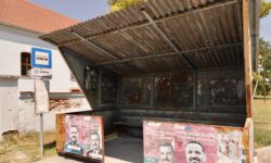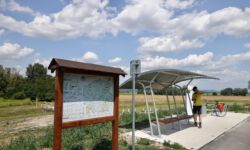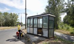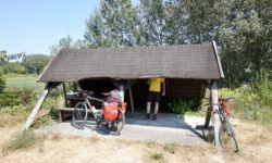 Den Abstecher zu einem Schiffswrack in der Donau müssen wir leider abbrechen. Der Weg ist unbefahrbar und total staubig. Also wieder zurück auf die sonnige Trasse. Nach einigen Kilometern gibt es tatsächlich ein kleines Dach auf der Trasse, das bestimmt als Sonnenunterstand und Schattenspender gedacht ist. Leider ist es so dämlich klein geraten, dass man gar nicht drunter stehen kann. Wir machen trotzdem eine kurze Pause, denn wir haben unentwegt Durst in der Hitze.
