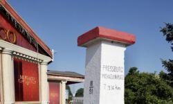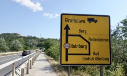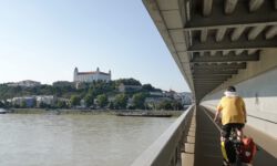 Kurz vor Hainburg dürfen wir endlich die Trasse verlassen und überqueren die breite Donau über eine fast zwei Kilometer lange große Brücke und fahren auf der anderen Seite der Donau weiter. Sehen können wir sie erst wieder in Hainburg. Hier halten wir kurz an und bitten ein Mädchen, ein Foto von uns vor der Donau zu machen, sonst glaubt uns nachher kein Mensch, dass wir an der Donau entlang gefahren sind. Dann geht es durch Hainburg und weiter durch Felder hindurch zur slowakischen Grenze. Wieder einmal keine Donau und kein Schatten in Sicht. Aber wir können in der Ferne schon Bratislava erkennen. An der Grenze gibt es (ganz wichtig!) ein Casino und einen alten Grenzstein. Im Casino gibt es immerhin kalte Getränke, die wir draußen in der Sonne trinken. Dann geht es weiter bis nach Bratislava. Ich sehe schon von weitem das UFO, das sich auf einer Donaubrücke befindet und in dem sich ein Restaurant befindet. Auf der anderen Donauseite können wir schon die Burg Bratislava sehen.