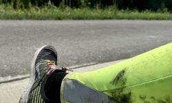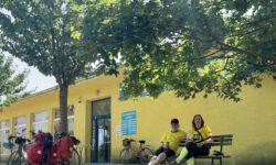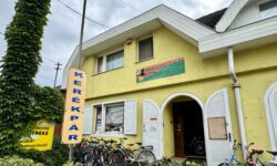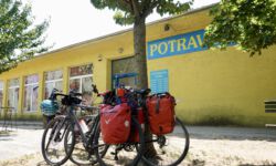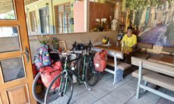 Ich habe zwar zwei Ersatzschläuche dabei, aber natürlich keinen Ersatzfahrradmantel. Also recherchiere ich nach einem Fahrradladen und werde schnell fündig. Ich finde den Fahrradladen von Balazs Lörinc, der nur einen Kilometer entfernt liegt und er macht um 09:00 Uhr auf. Das hört sich gut an, bis dahin werde ich wohl noch fahren können. Kann ich, auch wenn das Fahrrad wieder ganz schön herumschwabbelt, weil die Luft hinten fehlt und vorne eine Beule im Mantel das Fahrrad anhebt, wenn ich gerade über die Beule fahre. Ich eiere also den einen Kilometer zum Fahrradladen.