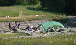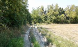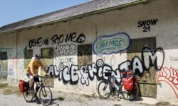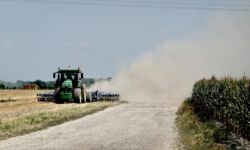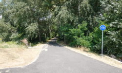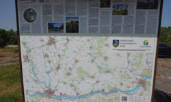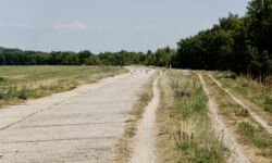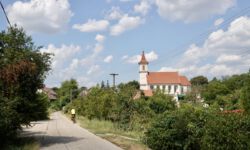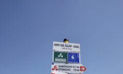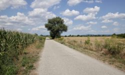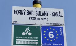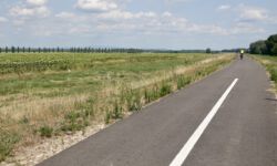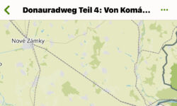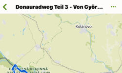 Weiter geht‘s, wir haben nur noch 15 Kilometer vor uns. Der Abstecher in den Ort bringt uns mit einem kleinen Umweg zurück auf die Trasse. Das geht schnell, denken wir, bis wir einem Trecker mit Walze begegnen, der eine fette Staubwolke produziert. Der Treckerfahrer sieht uns und stoppt für einige Minuten seine Arbeit, damit wir passieren können. Zum Glück! Die beiden Hofhunde, die aus der näxten Einfahrt schießen, lassen auch bald von uns ab. Dann wird der Weg allerdings immer schwieriger, weil uns heftige Schlaglöcher und Geröll am Fahren hindern. Also müssen wir ungefähr einen Kilometer schieben. Das dauert natürlich bei dem Weg. Dann geht es endlich wieder auf unsere Trasse. Die letzten Kilometer schaffen wir gut, denn Komárno ist bald in Sichtweite.