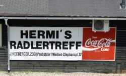 Wir fahren weiter bis mein Handy, auf dem uns die Navi-App den Weg weist, plötzlich schlapp macht. „TEMPERATUR Das iPhone muss abkühlen bevor es benutzt werden kann“ steht auf dem ansonsten schwarzen Display. Ich hole es erst einmal aus der Hülle und schwenke es ein bisschen durch die Luft, es ist allerdings so heiß geworden, dass ich es kaum anfassen kann. Etwas Schatten wäre jetzt ganz schön, gibt es hier aber nicht. Wir fahren weiter bis wir auf ein Schild „Schloss Eckartsau“ treffen. Da gibt es doch bestimmt etwas Schatten und ein kaltes Getränk. Also runter von der Trasse und über Schotter hin zum Schloss. Es liegt auf einer schönen grünen Rasenfläche und hat eine kleine Cafeteria, in der wir uns von innen und außen abkühlen können. Puhhh, endlich mal raus aus der Hitze. Das Handy kriegt sich auch wieder ein und die Navisoftware zeigt uns den weiteren Weg. Wir müssen noch einige Kilometer auf dieser heißen Trasse fahren. Zumindest bekommen wir keine nassen Füße, das ist ja auch schon mal was und der Gegenwind kühlt uns ab.