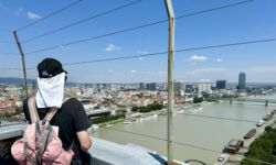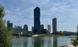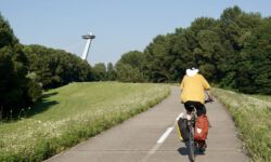 Heute startet unsere Fahrradtour (ohne E) von Wien nach Budapest mit dem ersten Abschnitt bis Bratislava. Der Wetterbericht verspricht warmes, sonniges Wetter. Das ist ja schon mal gut. Wir frühstücken nur kurz und schnallen dann unser Gepäck aufs Fahrrad. Das erste kurze Stück führt uns nur zur U-Bahn, die uns zum Start der Tour bis an die Donauinsel bringt. In Wien darf man Fahrräder außerhalb der Rushhour immer kostenfrei mitnehmen. Das gefällt mir. Bei uns muss man ein Tagesticket für 6,50 € kaufen, auch wenn man nur ein paar Stationen fahren möchte. Absurd. Wir steigen aus der U-Bahn, befinden uns aber noch nicht auf der Donauinsel. Wie kommen wir denn nun rüber? Der Weg liegt ein bisschen versteckt, denn man muss zuerst eine spiralförmige Rampe hoch, dann über eine Brücke und wieder runter auf die Insel fahren.