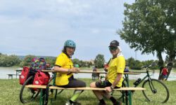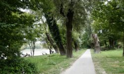 Jetzt können wir endlich losfahren. Der Weg führt vorbei an der Kathedrale und an der Donau entlang. Da Budapest nicht mehr weit ist, finden wir an vielen Ecken Restaurants oder Buden zum Auffüllen unserer Wasserflaschen. Da es heute nicht so warm ist, nur bis zu 29 Grad, haben wir genug Getränke dabei. Wir finden ein schönes Plätzchen an der Donau für die Mittagspause. Der Straßenbelag ist heute zeitweilig sehr gut und dann wieder richtig schlecht! Je näher wir an Budapest herankommen, umso mehr Leute tummeln sich auf den Wegen.