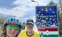 Wir überqueren jetzt die Donau und ein Schild weist uns darauf hin, dass wir nun in Magyaroszak, also Ungarn, sind. Juhu, geschafft. Aber von hier sind es noch rund 15 Kilometer bis Györ, unserem heutigen Tagesziel. Leider gibt es hier keinen Fahrradweg, dafür aber etwas Schatten entlang der Landstraße. Na, immerhin. Wir freuen uns, als wir endlich in Györ ankommen und uns in unserem vorgebuchten Hotelzimmer ausruhen können. Die Räder können sicher im Hinterhof parken.