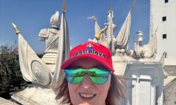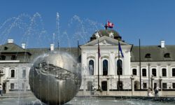 Weiter geht es am Platz der Freiheit vorbei, auf dem sich die Menschen in einer Wasserfontäne vergnügen, denn es ist schon wieder ordentlich warm. Wir gehen am Garten des Präsidentpalastes vorbei, der Palais Grassalkovich heißt. Heute ist er leider geschlossen, das Gebäude selbst ist aber recht imposant. Von da aus geht es in die schöne Altstadt mit ihren Gassen. Hier finde ich meine neue Länderkappe, die ich nun in der Slowakei trage. Das näxte Ziel ist die Burg, zu der wir über viele Treppenstufen und steile Wege gelangen. Hier oben haben wir einen genialen Blick auf die Altstadt, die Donau, die Brücke mit dem UFO und einige schöne Kirchen. Hier gibt es auch einen schönen Biergarten mit einer tollen Aussicht auf die Stadt, in dem wir uns ein Erfrischungsgetränk gönnen.
