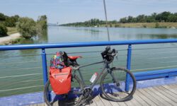 Es geht zuerst ein paar Kilometer durch Bratislava bis wir an der Donau sind. Wir können sie tatsächlich sehen und fahren an ihr entlang, so wie wir das vorgestern schon dachten. Es gibt allerdings auch hier eine Hochtrasse, die schnurgerade an der Donau entlang führt und manchmal auch ohne Sicht aufs Wasser, aber die ist nicht so lang. Wir haben etwas Rückenwind, so dass das Fahren heute besser läuft als vorgestern. Außerdem sind wir ja jetzt auch schon ordentlich trainiert. An einer schönen Stelle am Wasser baue ich erst einmal mein Stativ auf und wir machen ein Selfie mit den Fahrrädern.