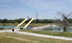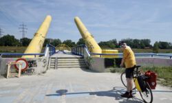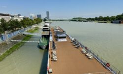 Nun kann das Fahrradvergnügen endlich starten. Es ist jetzt schon ganz schön warm. Die Donauinsel ist insgesamt 21 Kilometer lang und ein wunderbares Naherholungsgebiet für Fußgänger, Jogger oder Fahrradfahrer. Wir fahren ungefähr zehn Kilometer auf der Insel entlang an der schönen blauen bzw. eher braunen Donau mit Blick auf Wien. Mit Klaus‘ Knie müssen wir zwar etwas Tempo rausnehmen, aber es schlägt sich tapfer. Ich fahre etwas schneller und mache derweil Fotostops, bis das grüne Fahrrad wieder in Sichtweite kommt. Dann müssen wir nördlich der Donau wieder aufs Festland rüber. Eine Pontonbrücke, nur für Fußgänger und Radfahrer, bringt uns auf die andere Seite. Hier ist FKK angesagt, aber wir dürfen unsere Klamotten anlassen. Ich möchte auch nur ungern mit dem Hintern auf dem heißen Sattel festkleben. Eine Frau verrät uns, wo wir die Böschung hochfahren können, denn mit dem schweren Gepäck schaffen wir es vermutlich sonst nicht unfallfrei nach oben.
