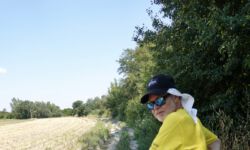 Heute haben wir eine relativ kurze Strecke vor uns, daher lassen wir uns etwas Zeit mit dem Frühstück. Der Wetterbericht hat sich nicht verändert. Es bleibt sonnig und heiß. Wir müssen zuerst auf die Nordseite der Donau, daher geht es wieder zurück zur Grenze. Wir umfahren die Landstraße so weit es geht und landen zwischen zwei Sonnenblumenfeldern. Auf der rechten Seite sehen alle Sonnenblumen weg von uns, auf der linken Seite strecken sie ihre Köpfe zu uns hin. Das sieht echt lustig aus, haben sich alle abgesprochen.