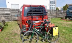 Zwischendurch Hunger, gestillt durch Müsliriegel, und am Abend dann Burger und Bowles. Mückenstiche und Erlösung durch Fenistil-Gel. Kräftige Oberschenkel voller Energie, die aber auch ganz schön brennen können, wenn‘s mal wieder bergauf geht. Letzendlich große Freude, wenn wieder mal eine im wahrsten Sinne „Durststrecke“ absolviert wurde und das verdiente Belohnungsbier vor einem steht. Die tapferen Drahtesel hätten auch eine Belohnung verdient, trinken allerdings weder Bier noch Wasser, aber zumindest mein kleiner Edelhelfer darf von nun an auf zwei brandneuen, mit viel Liebe aufgezogenen, Reifen rollen und freut sich schon auf die näxte Tour.