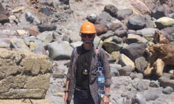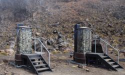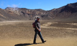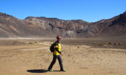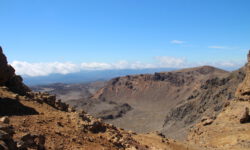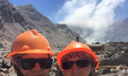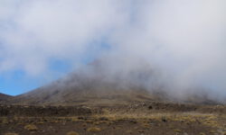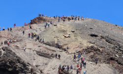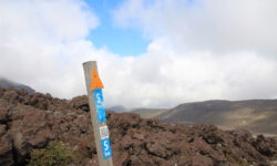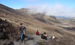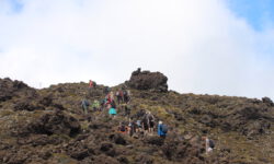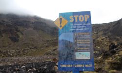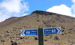 Endlich geht‘s los. Die ersten vier Kilometer sind gut zu schaffen, dann taucht ein Schild auf. Ab hier wird es schwieriger und wer sich nicht fit genug fühlt, der sollte umkehren. Ich sehe niemanden, der das auf sich bezieht, alle laufen weiter. Jetzt geht es erst einmal ordentlich bergauf, manchmal sind Stege oder Treppenstufen da, manchmal feste oder auch lose Steine. Der Puls kommt in Wallung. Immer wieder bleiben Leute kurz stehen, wir natürlich auch, und dann sieht man sich ein paar Meter weiter oben wieder. Der Vulkan an dem wir entlang laufen, spuckt ab und zu weiße Wolken aus. Wir kämpfen uns hoch bis zum Kraterrand des Red Krater, der aber ganz ruhig ist. Hier oben machen wir nach ca. drei Stunden die erste Pause, essen unsere Stullen und treffen wieder bekannte Gesichter.