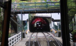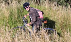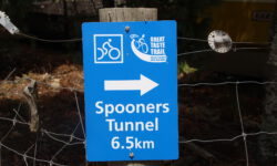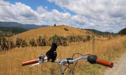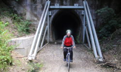 Wie gut, dass die nette Wirtin uns noch den Hinweis gibt, dass es im Tunnel stockdunkel ist. Wir schnappen uns noch schnell unsere Kopflampen und dann geht es los. Die als Fahrradtrail ausgewiesene Wegstrecke ist eine schreckliche Schotterpiste, mit mal mehr, mal weniger vielen Steinen. Unsere Klapperräder sind nicht die besten für diesen Weg, der auf dem Hinweg nur bergauf geht. Da wir das erst einmal nicht wissen und immer auf eine Besserung warten, kämpfen wir uns den Berg hoch. Irgendwann kommt dann der berüchtigte Tunnel. Der ist zwar stockdunkel, aber zum Glück nicht mit Schottersteinen ausgestattet.