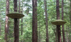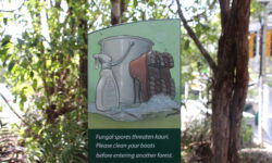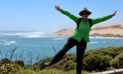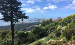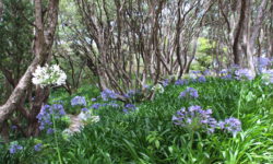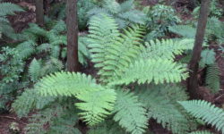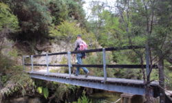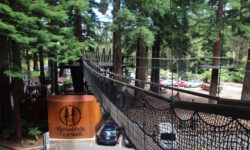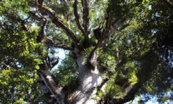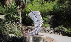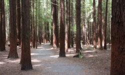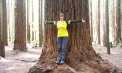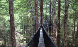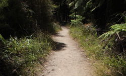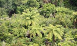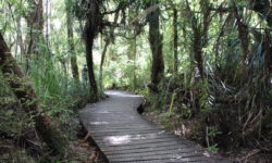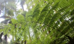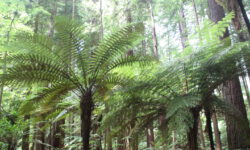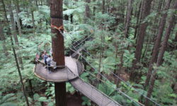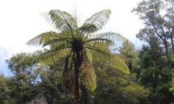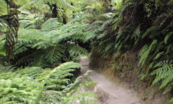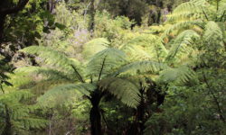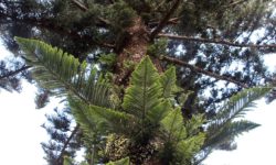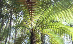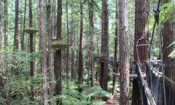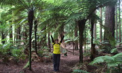 Es geht Wandern. Zuerst durch einen Wald mit den hohen Redwoods. Wir laufen den Redwoods Treewalk mit 28 schwabbelig aufgehängten Verbindungsbrücken in neun bis zwanzig Metern Höhe. Von da oben aus hat man eine gute Sicht in den Wald. Die großen Lampions hängen da für den Walk im Dunklen. Wieder unten laufen wir auf einem der vielen Wanderwege durch die Redwoods und die Riesenfarne, die mir besonders gut gefallen.