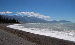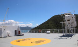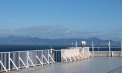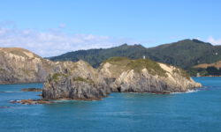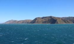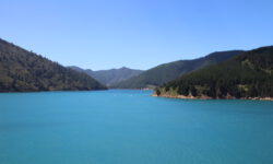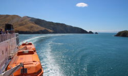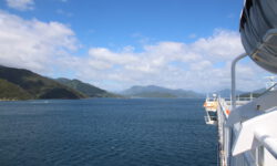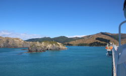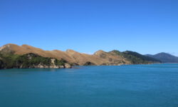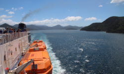 Die Fährfahrt zur Südinsel kommt uns wie eine kleine Kreuzfahrt vor. Es ist sonnig, wir stehen auf dem Deck der Interislander Ferry. Innerhalb von zwei Stunden überqueren wir die Cook Strait und fahren noch eineinhalb Stunden weiter durch die Meeresarme der Marlborough Sounds bis hin zum Queen Charlotte Sound. Ein paar Delphine begleiten uns kurz durchs offene Meer. Leider dürfen wir wegen zu starken Windes nicht bis zum Bug laufen. Aber auch so sind die Aussichten auf die Berge und die vielen kleinen Meeresarme fantastisch.