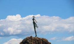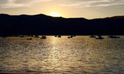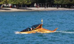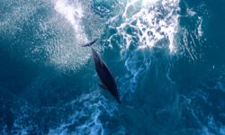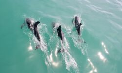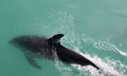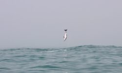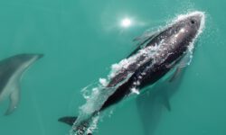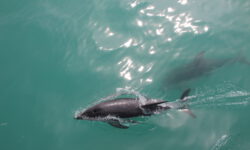 Es klart mittlerweile etwas auf und wir können die Delfine schon von weitem sehen. Sie springen immer wieder aus dem Wasser. Der Käpt’n bläst für die näxte Schwimmrunde ins Horn und es geht wieder ins Wasser. Da sind sie, die gut gelaunten Delfine, die um uns herum schwimmen. Sie tauchen immer wieder auf und unter. Zwei schwimmen mit mir im Kreis, ändern die Drehrichtung, ich ändere sie auch und bin hin und weg von dem tollen Abenteuer im Wasser. Für meine Wasserkamera sind sie allerdings zu schnell, also verzichte ich auf Fotos und singe lieber weiter durch den Schnorchel.