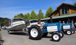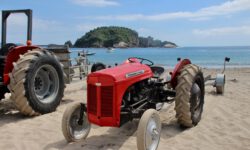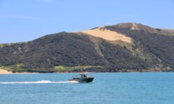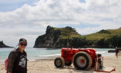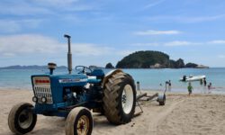 Der Rückweg dauert viel länger, es geht ziemlich steil bergauf, die Sonne brutzelt. Aber wir wollten ja sowieso ein bisschen Sport treiben. Oben auf dem Berg warten unsere Fahrräder, mit denen wir zum Strand im Ort Hahei fahren. Da ist gerade ein Treckertreffen am Strand, zumindest sieht es so aus. In Wirklichkeit stehen die Trecker da nur, weil sie als Transportfahrzeuge für die Boote der Leute aus dem Ort dienen. Die fahren mal eben mit ihrem Boot zum Strand, drehen ein paar Runden und dann geht es mit dem Boot auf dem Trecker wieder zurück nach Hause. Klasse.