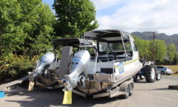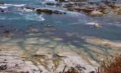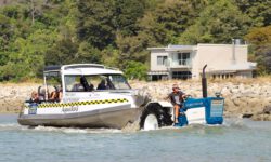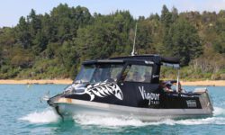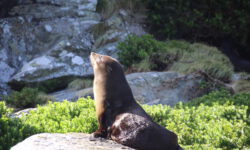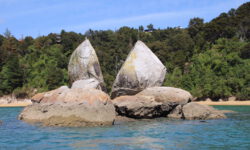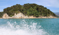 Wir steigen zusammen mit anderen in eins der Boote und es geht los. Mit dem Trecker, der das Boot zieht, geht es über die Straße zum Strand. Dann fährt der Trecker einfach ins Wasser, dreht eine Runde und lässt dann das Boot zu Wasser. Wir staunen. Der Käpt’n erzählt uns was zur Strecke und fährt erst mal langsam los. Dann wird der Außenbordmotor abgesenkt und wir kriegen ordentlich Schub von hinten. Zuerst geht es zum Split Apple Rock, dann zu den Seehunden und schließlich zur Torrent Bay.
